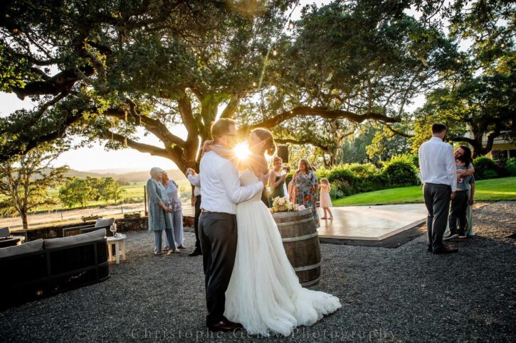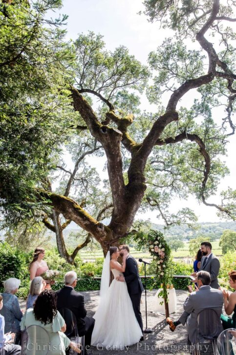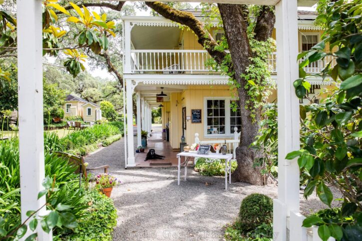 It’s a golden morning in Sonoma, where a warm breeze dances through the leaves of century-old oak trees. At the heart of this picturesque scene stands the Ranch House, a charming two-story yellow home with a white wrap-around porch, draped in blooms as if nature itself is celebrating your love story.