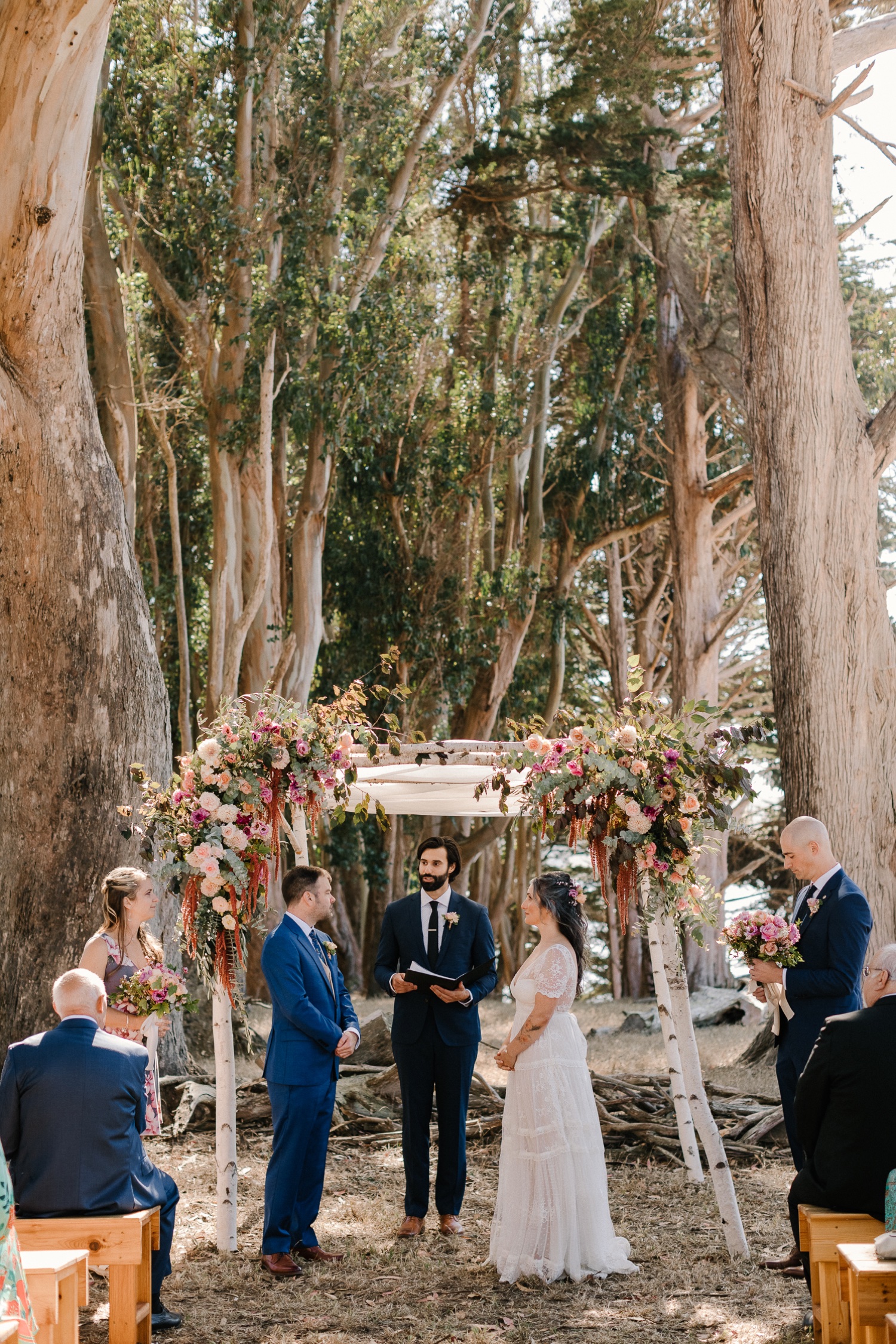 You start at the top—literally and emotionally. The ceremony happens on a secluded knoll, wrapped in eucalyptus and cypress trees, with Tomales Bay stretching out below you. It’s peaceful in a way that makes people instinctively lower their voices. The kind of place where vows don’t feel like a performance, they feel like a promise.